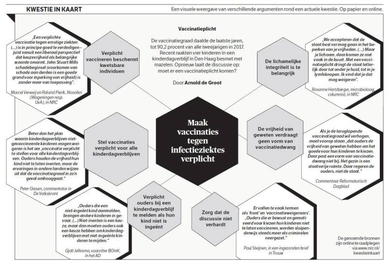 Arnold de Groot heeft voor NRC Handelsblad een visuele weergave gemaakt van argumenten over verplichte vaccinatie. Er valt natuurlijk nog veel meer over te zeggen (daar schrijven we een boek over) maar dit zijn wel centrale bijdragen in het debat.