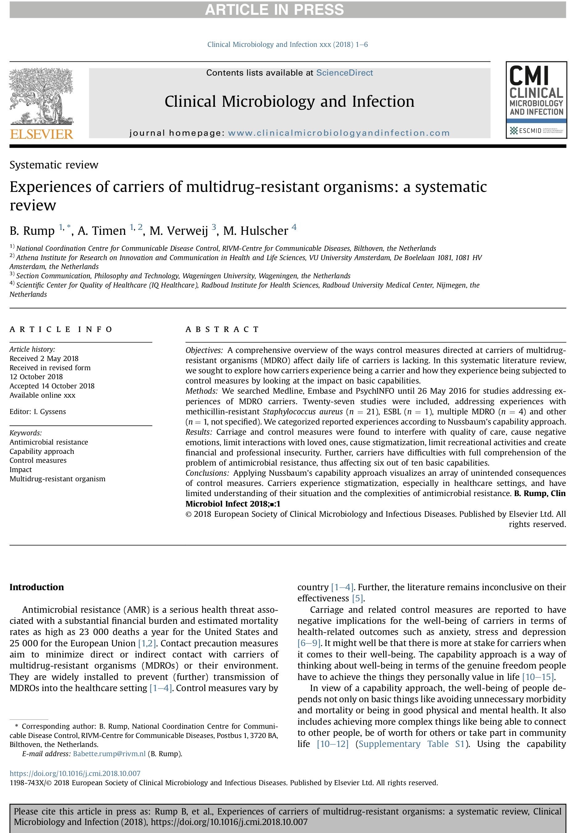 In a joint ZonMW-funded project with RIVM (National Institute of Public Health and the Environment and RadboudMC we explore the ethical aspects of asymptomatic carriership of antibiotic resistance. The Netherlands are relatively successful in preventing outbreaks of antibiotic resistant microbes in hospital settings, thus limiting the mortality due to ABR. This success is at least partly due to high-level 'search and destroy' approaches, but those approaches can be very burdensome for persons who appear to be (asymptomatic) carrier of a resistant form of specific microbe.They may involve quarantine, contact isolation, social distancing, prolonged eradication treatment and postponement of for example surgery.