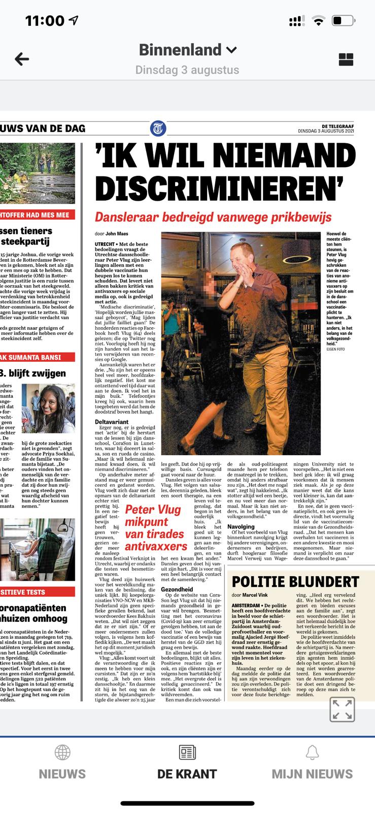 - Twee kleine interrupties tijdens de vakantie: een uitgebreid interview met de Telegraaf waar uiteindelijk maar op 3 augustus maar een klein stukje van overblijft: mag een dansleraar ongevaccineerden uitsluiten van dansles? Het lijkt mij wel.En op 22 juli een wat uitgebreider gesprek op Radio1 met Toine van Peperstraten: hoe nu verder als straks iedereen gevaccineerd is? Dreigt een tweedeling in de maatschappij?