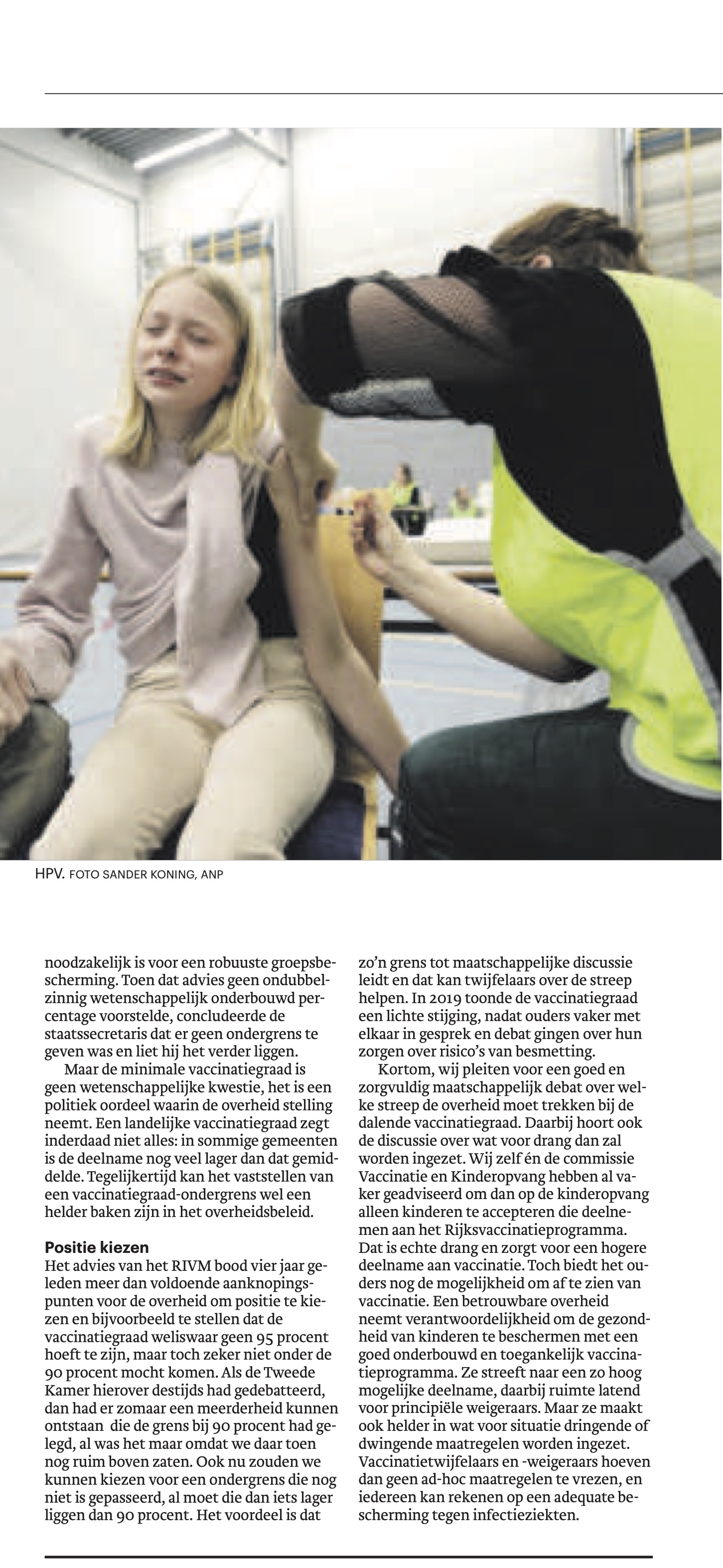 - 30 maart 2024 De vaccinatiegraad daalt naar een dieptepunt, en dat is reden voor discussie. Naast roep om een vaccinatieplicht schrijf ik samen met Roland Pierik een opiniestuk waarin we oproepen om vooral een betrouwbaar vaccinatiebeleid te ontwikkelen, waarin de overheid verantwoordelijkheid neemt. We herhalen daarin ons voorstel om een wettelijk verankerde ondergrens voor de vaccinatiegraad vast te stellen: Overheid, zorg voor een betrouwbaar vaccinatiebeleid + link naar PDF van de geprinte versie: pagina 1 en pagina 2